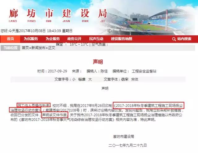 29日廊坊市建设局官方网站和今天廊坊市建设局官方微信发布声明称:该文件作废?。?!