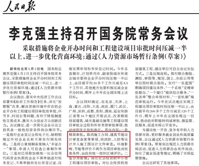 5月2日召开的国务院常务会议,明确将企业开办时间和工程建设项目审批时间压减一半以上,进一步优化营商环境。