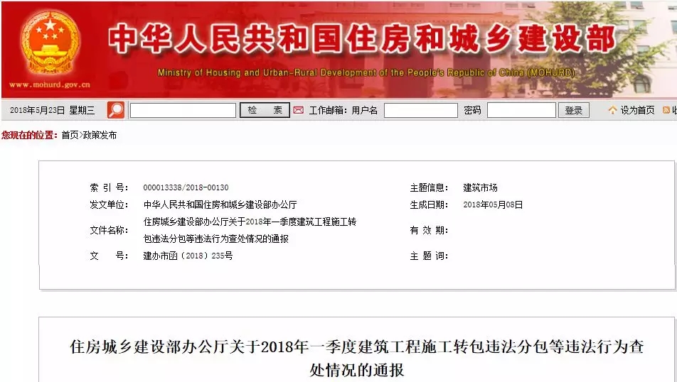 住房城乡建设部办公厅关于2018年一季度建筑工程施工转包违法分包等违法行为查处情况的通报