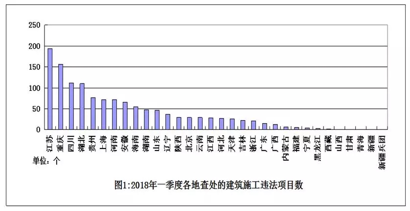 从各地查处的违法工程项目数量看,江苏、重庆、四川、湖北4省(市)查处力度较大,分别查处项目194个、156个、112个、110个(见图1)。