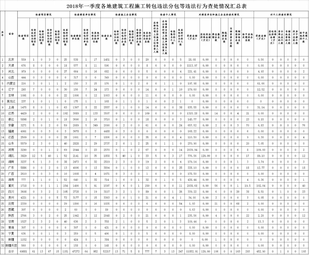 附件:2018年一季度各地建筑工程施工转包违法分包等违法行为查处情况汇总表(见下图)