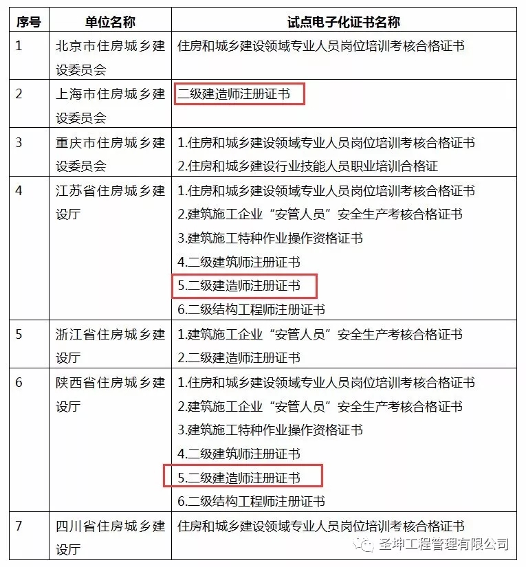 住建部下发《关于同意在部分地区开展住房和城乡建设领域从业人员有关证书电子化试点的复函》,将全面开展二级建造师证书、“三类人员”证书(A/B/C证)、住房和城乡建设领域专业人员岗位培训考核合格证书等电子化试点工作,将在7省市(北京市、上海市、重庆市、江苏省、浙江省、陕西省、四川?。┛?。