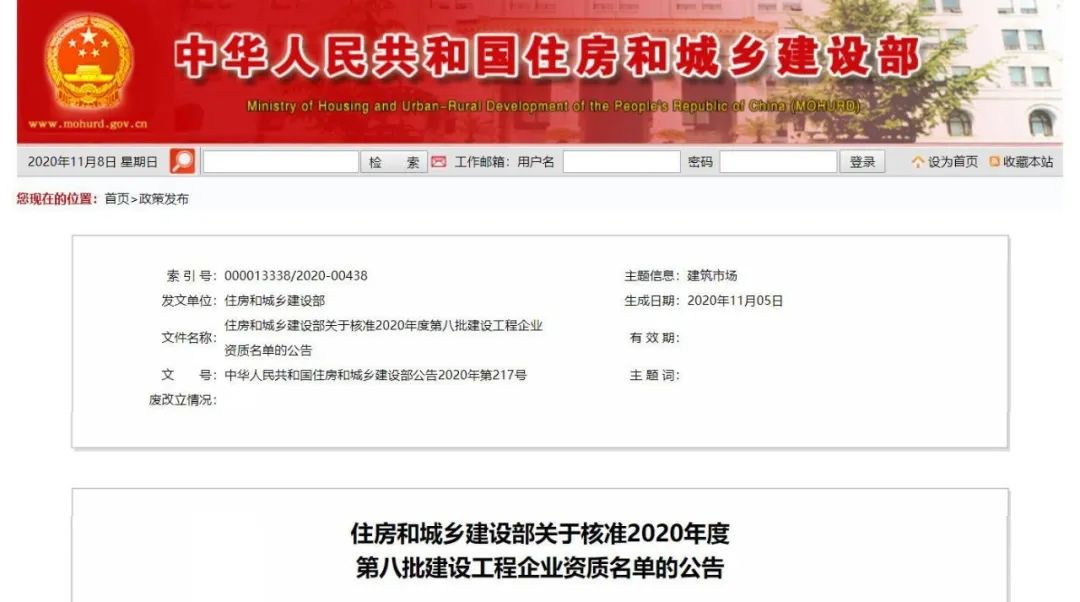 11月6日,住建部发布关于核准2020年度第八批建设工程企业资质名单的公告,其中包括核准建筑业企业资质的单位名单。