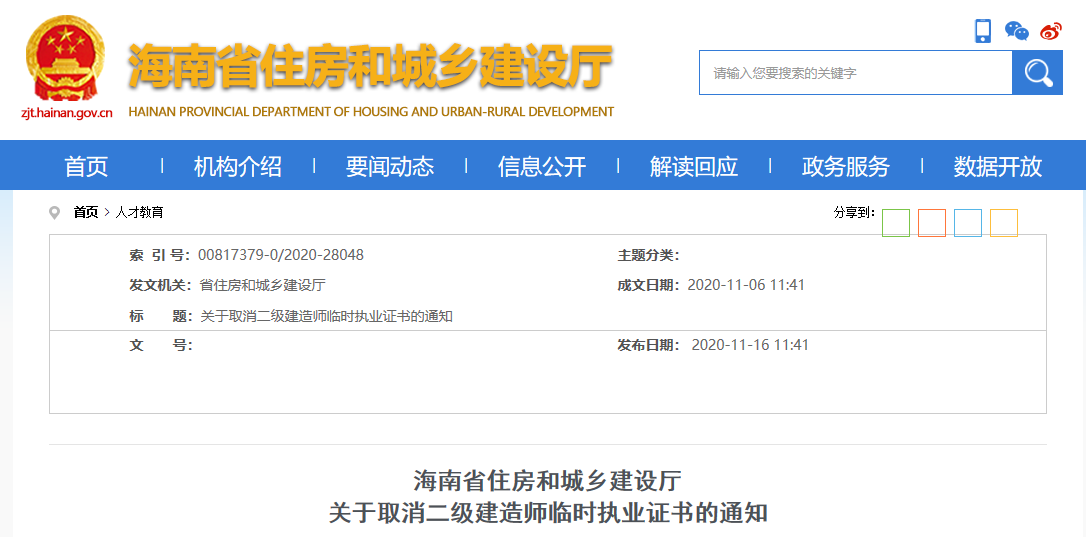 近日,海南省住建厅发布《关于取消二级建造师临时执业证书的通知》,明确宣布自通知印发之日起,取消二级建造师临时执业证书,最迟截止时间到2020年12月31日。