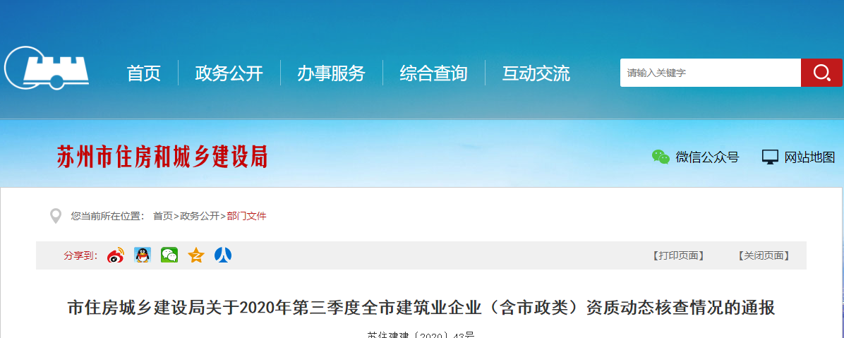 一、苏州:139家建筑企业被点名10月30日,苏州住建局下发《市住房城乡建设局关于2020年第三季度全市建筑业企业(含市政类)资质动态核查情况的通报》苏住建建〔2020〕43号,提到:
