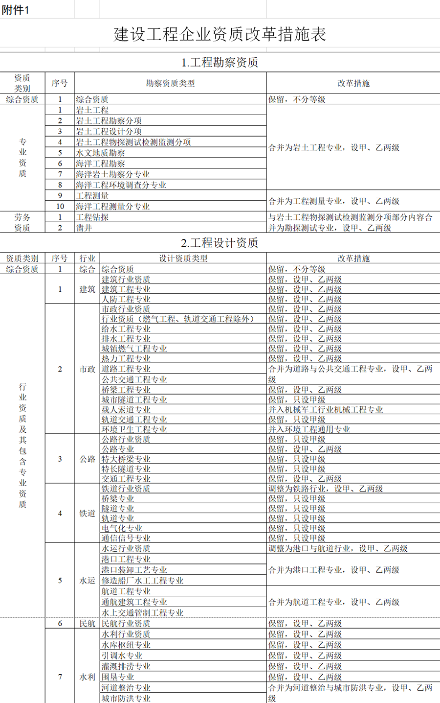 1.工程勘察资质。保留综合资质;将4类专业资质及劳务资质整合为岩土工程、工程测量、勘探测试等3类专业资质。综合资质不分等级,专业资质等级压减为甲、乙两级。
