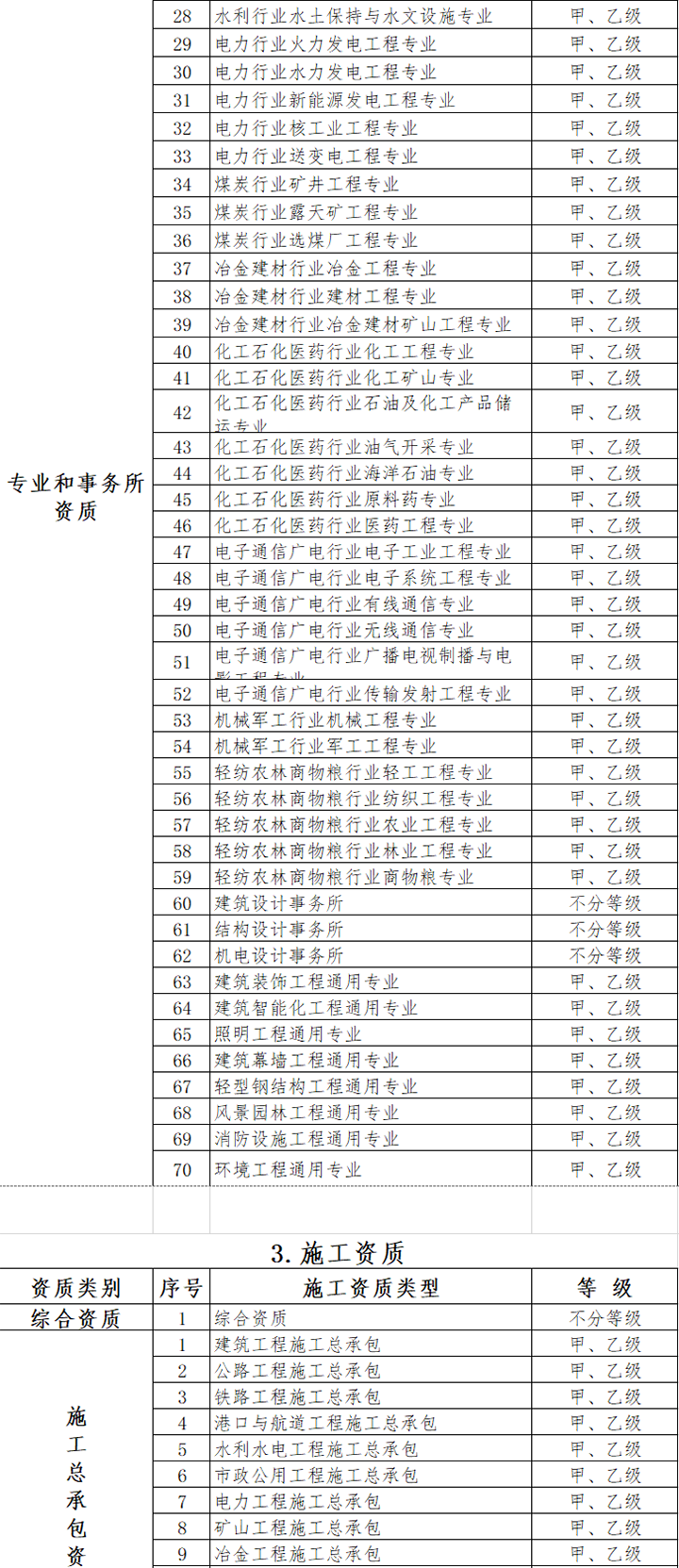 2.工程设计资质。保留综合资质;将21类行业资质整合为14类行业资质;将151类专业资质、8类专项资质、3类事务所资质整合为70类专业和事务所资质。综合资质、事务所资质不分等级;行业资质、专业资质等级原则上压减为甲、乙两级(部分资质只设甲级)。