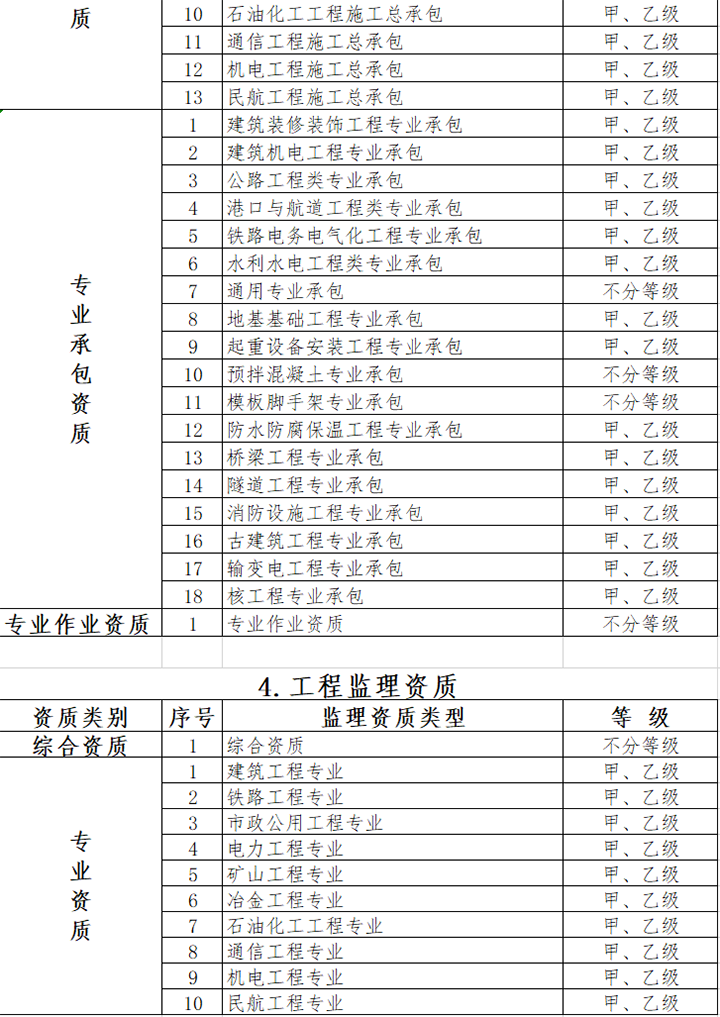 3.施工资质。将10类施工总承包企业特级资质调整为施工综合资质,可承担各行业、各等级施工总承包业务;保留12类施工总承包资质,将民航工程的专业承包资质整合为施工总承包资质;将36类专业承包资质整合为18类;将施工劳务企业资质改为专业作业资质,由审批制改为备案制。综合资质和专业作业资质不分等级;施工总承包资质、专业承包资质等级原则上压减为甲、乙两级(部分专业承包资质不分等级),其中,施工总承包甲级资质在本行业内承揽业务规模不受限制。