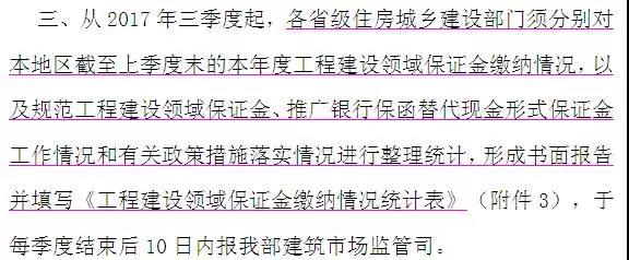 日前住建部发布建办市函[2017]460号文,明确要求各省级住房城乡建设部门须每季度要把推广银行保函替代现金形式保证金工作情况和有关政策措施落实情况进行整理统计,形成书面报告,进行上报,意思也很明确:各省要加快推广银行保函替代现金形式保证金