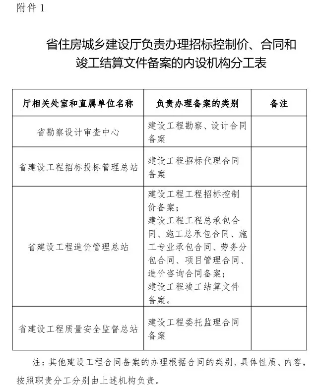 1.省住房城乡建设厅负责办理招标控制价、合同和竣工结算文件备案的内设机构分工表