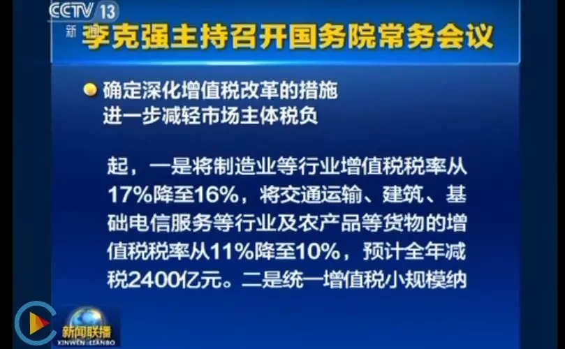一是将制造业等行业增值税税率从17%降至16%,将交通运输、建筑、基础电信服务等行业及农产品等货物的增值税税率从11%降至10%,预计全年可减税2400亿元。