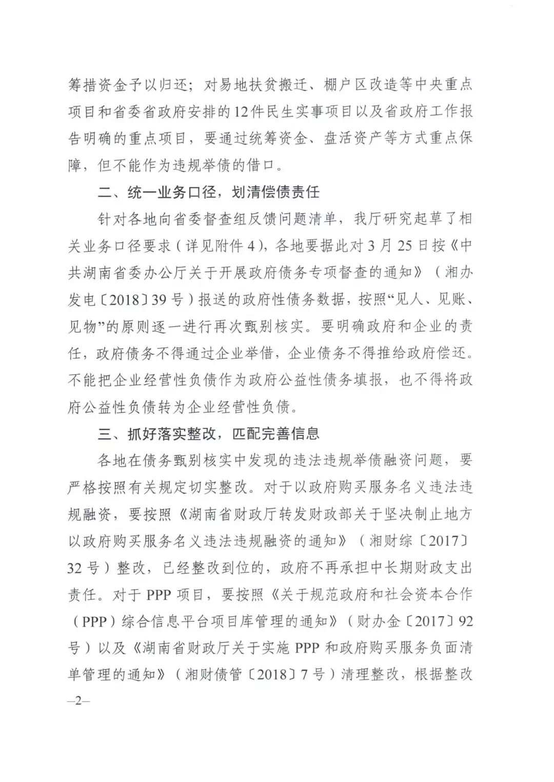 各地在债务甄别核实中发现的违法违规举债融资问题,要严格按照有关规定切实整改。对于以政府购买服务名义违法违规融资,要按照《湖南省财政厅转发财政部关于坚决制止地方以政府购买服务名义违法违规融资的通知》(湘财综[2017]32号)整改,已经整改到位的,政府不再承担中长期财政支出责任。对于PPP项目,要按照财办金[2017]92号文以及《湖南省财政厅关于实施PPP和政府购买服务负面清单管理的通知》(湘财债管[2018]7号)清理整改,根据整改情况相应调整中长期财政支出责任。
