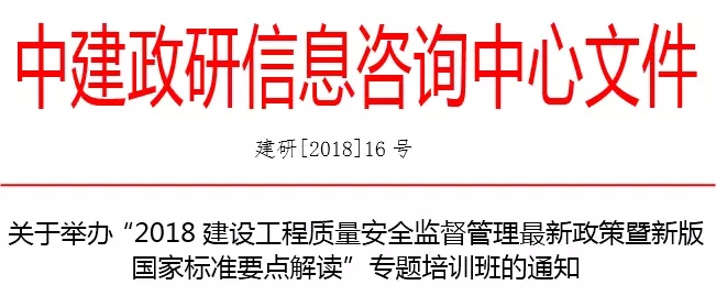 当前建设行业改革发展新趋势下的工程建设安全工作如何推进,已经成为广大施工企业、设计、监理、建设企业的关注重点。为规范工程参建各方主体的质量安全行为,促进工程建设各方主体严格落实质量安全主体责任,加强质量安全风险管控,提高工程项目质量安全的可靠性。中建政研信息咨询中心特举办“2018建设工程质量安全监督管理最新政策暨新版国家标准要点解读”专题培训班,现将有关事项函告如下: