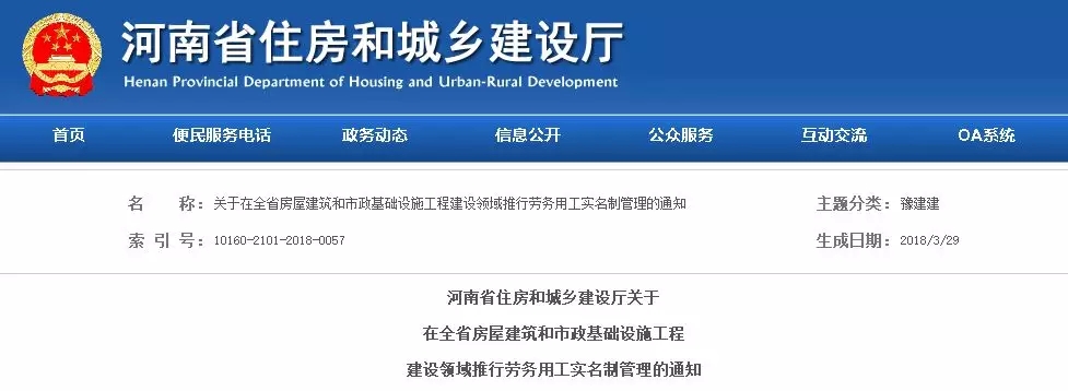 2018年3月,河南省住建厅印发《在全省房屋建筑和市政基础设施工程建设领域推行劳务用工实名制管理的通知》(豫建建〔2018〕16号)。