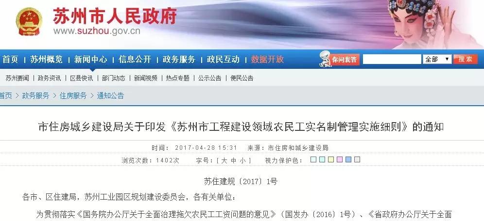 2017年4月28日,苏州市印发《工程建设领域农民工实名制管理实施细则》。