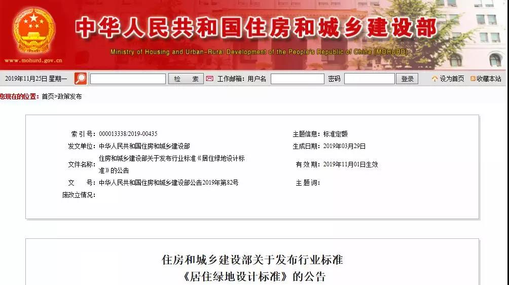 《居住绿地设计标准》为行业标准,编号为CJJ/T294-2019,自2019年11月1日起实施。