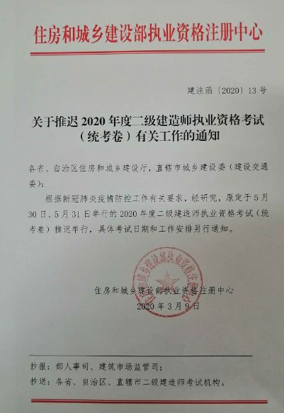 按照住房和城乡建设部执业资格注册中心《关于推迟2020年度二级建造师执业资格考试(统考卷)有关工作的通知》(建注函〔2020〕13号),根据新冠肺炎疫情防控工作有关要求,2020年度二级建造师执业资格考试(统考卷)推迟举行,具体考试时间和工作安排另行通知。