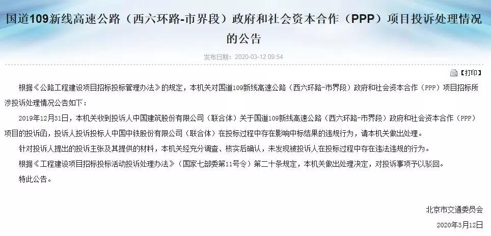 通告显示,2019年12月31日本机关收到投诉人中国建筑股份有限公司(联合体)关于国道109新线高速公路(西六环路-市界段)政府和社会资本合作(PPP)项目的投诉函,投诉人投诉投标人中国中铁股份有限公司(联合体)在投标过程中存在影响中标结果的违规行为,请本机关做出处理。
