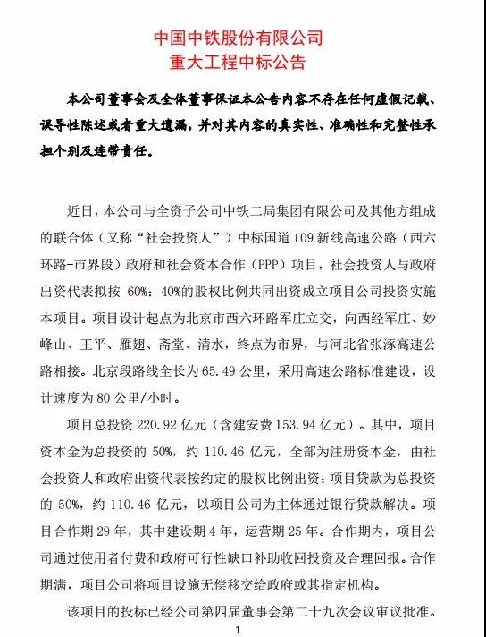 近日,公司与全资子公司中铁二局集团及其他方组成的联合体,中标国道109新线高速公路(西六环路-市界段)政府和社会资本合作(PPP)项目,社会投资人与政府出资代表拟按60%:40%的股权比例共同出资成立项目公司投资实施该项目。项目总投资220.92亿元(含建安费153.94亿元)。