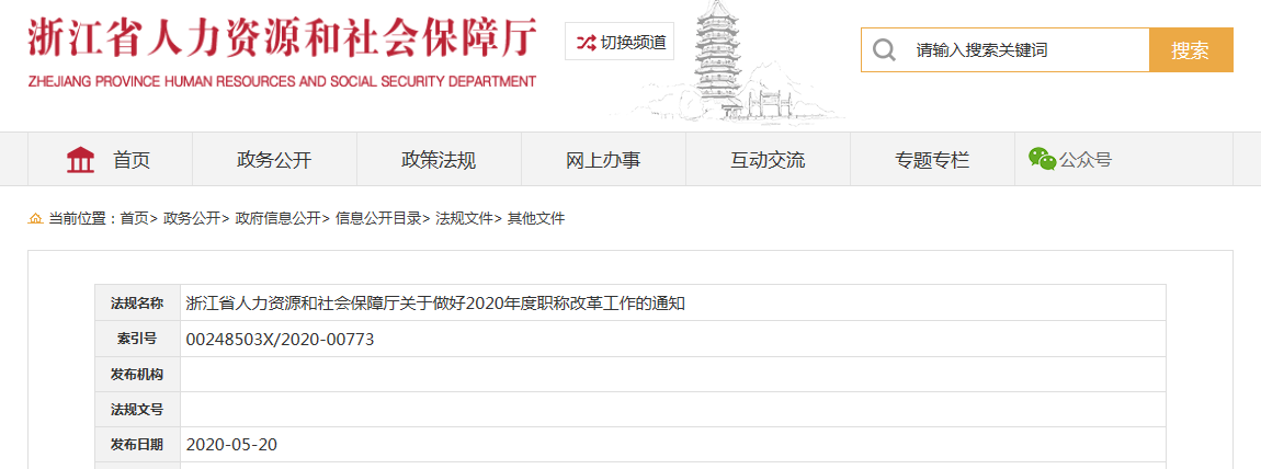 (三)相关资料下载。评审工作相关表格见附件,可在“浙江政务服务网—高级职称评审与专技考试”栏目下载。其他有关评审要求和程序未在本通知中明确的,仍按照省人力社保厅2019年度职称改革工作的通知中相关要求执行。附件:2020年度高级职称评审计划浙江省人力资源和社会保障厅2020年5月8日