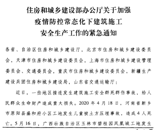 日前,住建部办公厅下发《关于加强疫情防控常态化建筑施工安全生产工作的紧急通知》。通知指出,为深刻吸取河南新乡“4·18”四死事故、广西玉林“5·16”六死事故和内蒙古包头“5·19”三死事故等教训,决定立即组织安全生产隐患大排查。1、重点检查施工现场塔式起重机、施工升降机、物料提升机等大型设备;