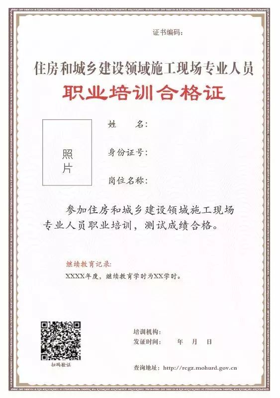住房和城乡建设领域施工现场专业人员职业培训合格证样式