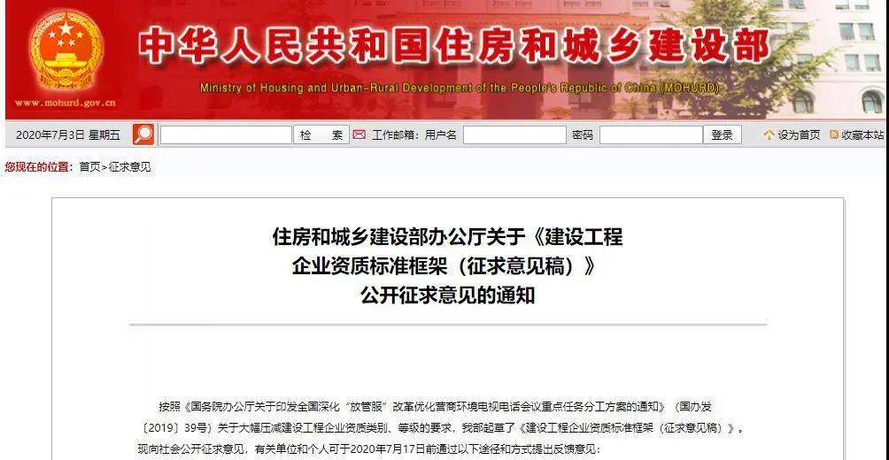 7月2日,住建部发布《住房和城乡建设部办公厅关于<建设工程企业资质标准框架(征求意见稿)>公开征求意见的通知》,在通知中明确: