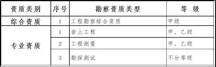 保留综合资质。将4类专业资质及勘察劳务资质整合为岩土工程、工程测量、勘探测试等3类专业资质。专业资质等级压减为甲、乙两级(勘探测试专业资质不分等级),原丙级资质并入相应专业乙级资质。