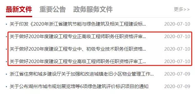 7月10日,浙江省住建厅连续发布通知,对今年的建设工程专业初级/中级/高级/正高级技术职务任职资格评审工作做出安排。